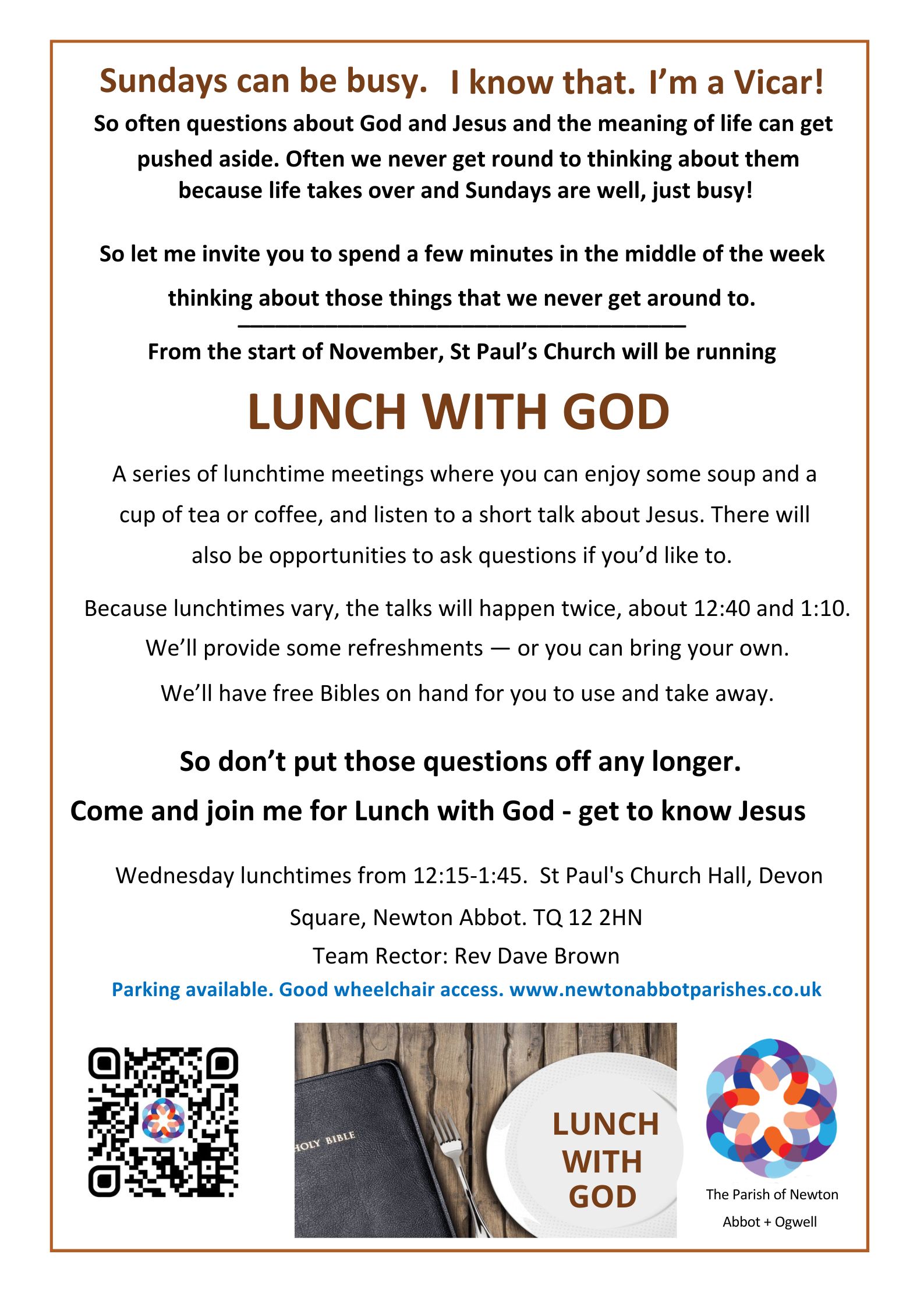 Bible teaching in Paul’s Church Hall. 12:15 to 1:45 p.m. Free soup and hot drink.