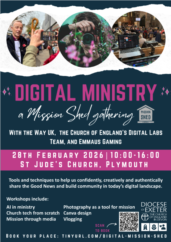 How can we confidently and creatively share the Good News and build communities within our increasingly digital landscape? What are today’s best tools and techniques and what does it mean to be authentic, contextual communicators? This one-day event led by the Diocese of Exeter’s Mission Shed team, will feature talks and workshops from the Church of England Digital Labs Team and Emmaus Gaming, as well as worship from Steve Gibson.