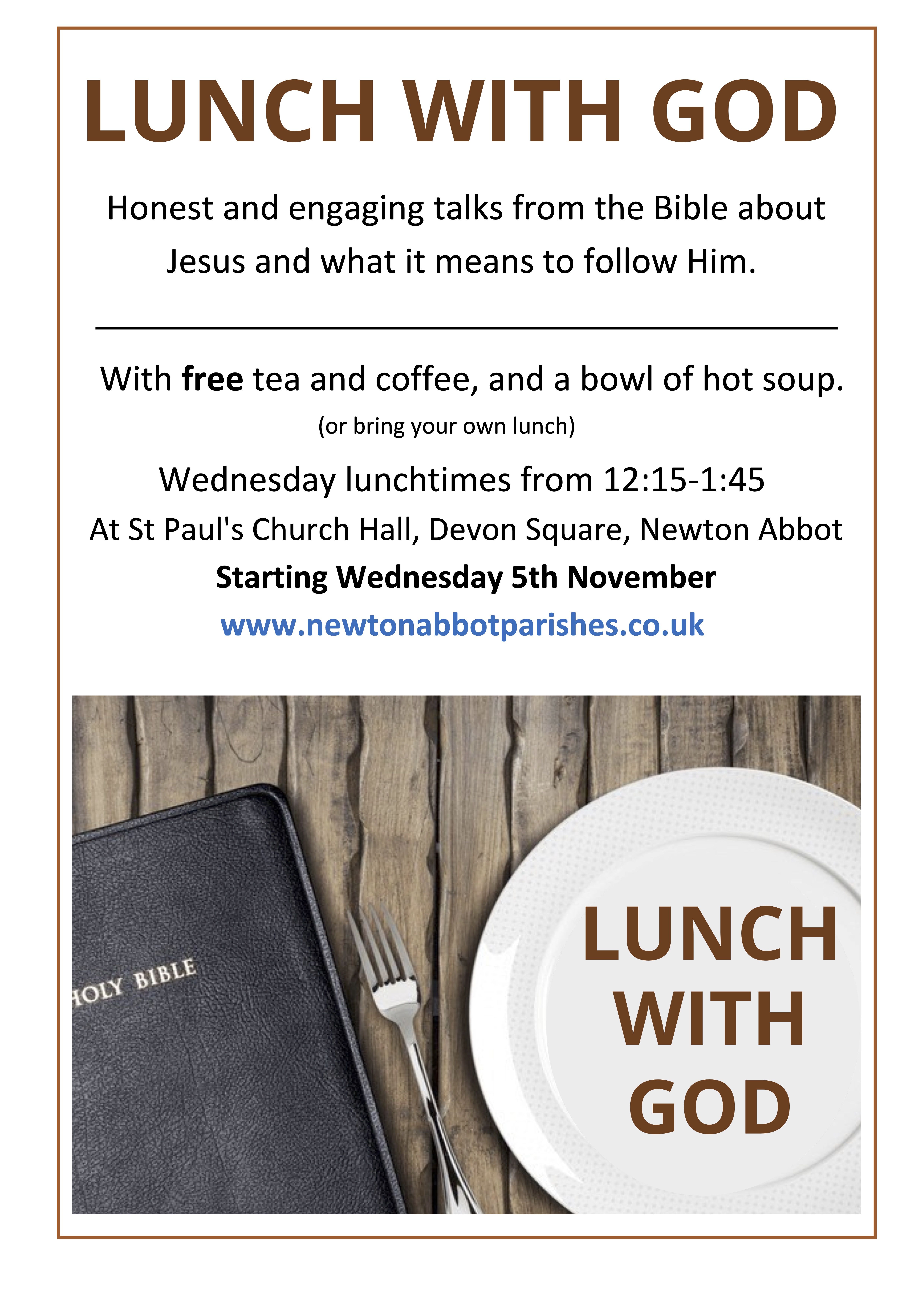 Bible teaching in Paul’s Church Hall. 12:15 to 1:45 p.m. Free soup and hot drink.